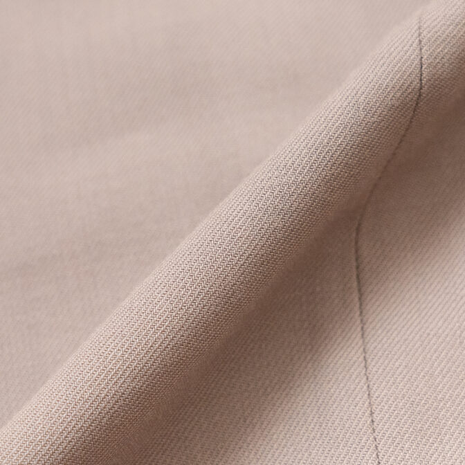 通常1本の粗糸を細く伸ばして糸に紡ぐところを、2本の粗糸から1本の糸にする特殊な手法を採用した生地です、毛羽の少ない、カジュアルになりすぎず、肉感、ハリ感を備えた生地です。