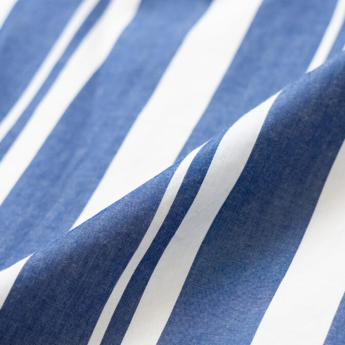 世界三大高級綿と言われる「新彊超長綿」から製糸された生地です。やや薄手で、しなやかな風合いと適度なコシ感をもちます、クリアな表面で、上質な印象を与えるストライプです。
