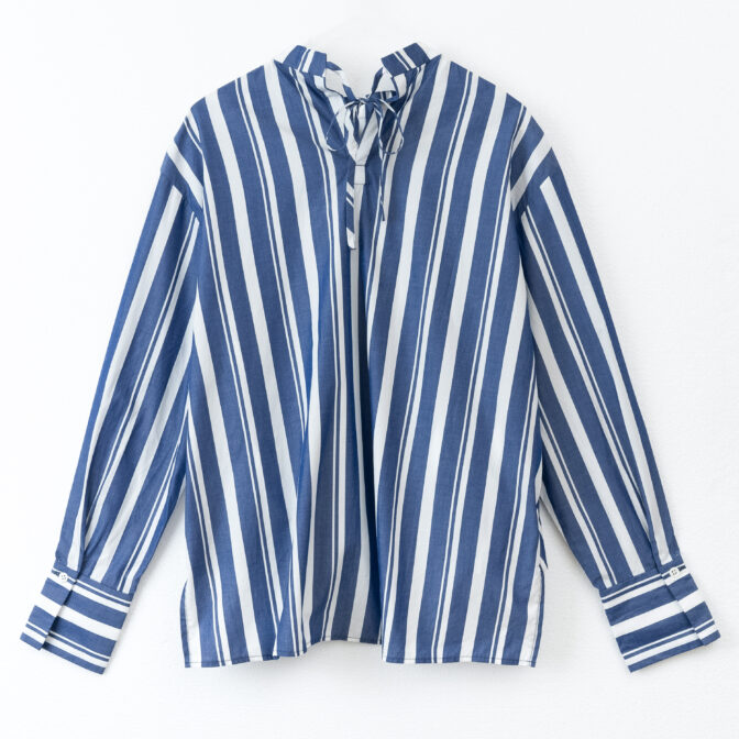 襟の後ろを紐で結ぶ仕上げにしており、リボンを結んでいるような女性的な印象を与えます。
